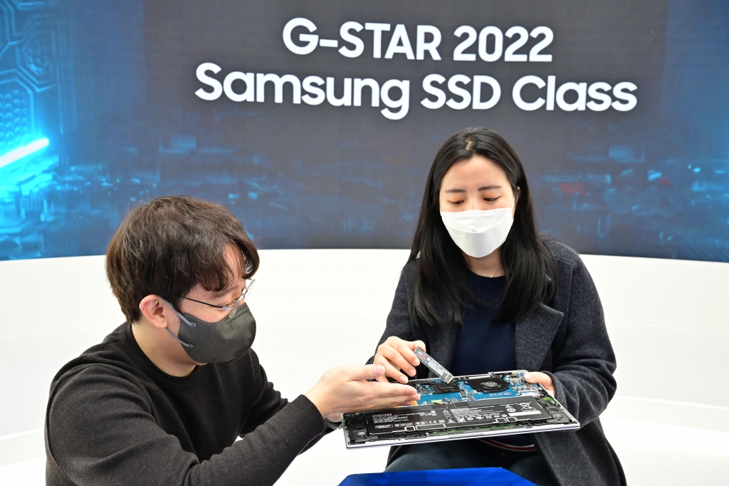 ▲지스타에 참석한 관람객이 삼성전자 브랜드관에 마련된 ‘SSD 클래스’를 통해 990 PRO 제품을 PC에 직접 설치해보고 있는 모습