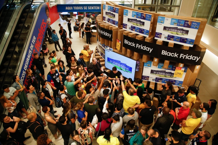 ▲삼성전자가 11월 25일 블랙프라이데이를 맞이해 마련한 브라질 상파울루시 매장에 수 많은 고객들이 Neo QLED, 더 프레임 등 삼성전자 TV 제품을 구매하기 위해 운집한 모습.
