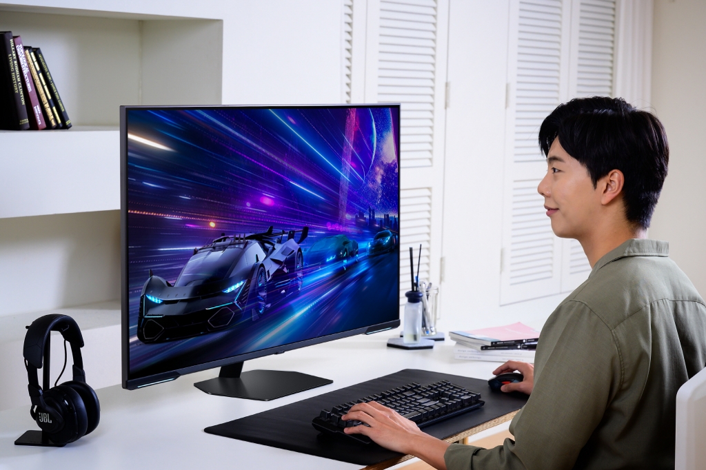▲삼성전자 모델이 내년 1월 2일 출시 예정인 43형의 대화면 게이밍 모니터 ‘오디세이 네오 G7’을 사용하고 있는 모습