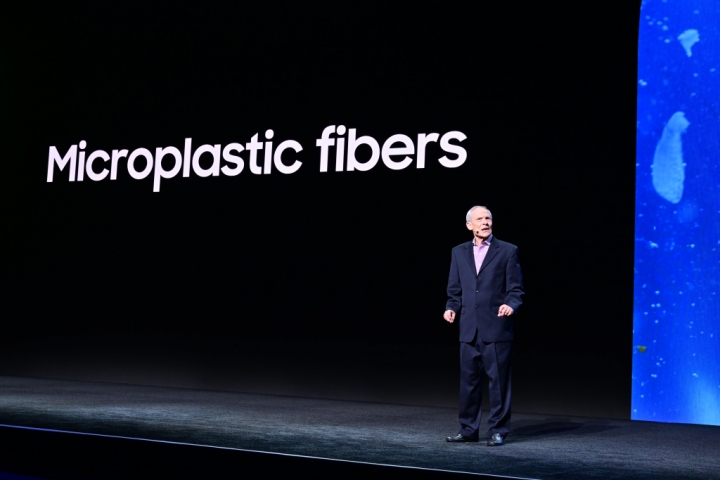 ▲ 파타고니아의 최고 철학 책임자인 빈센트 스탠리(Vincent Stanley)가 삼성 프레스 컨퍼런스에서 미세 플라스틱 저감을 위한 삼성전자와의 협업 내용을 소개하고 있다.
