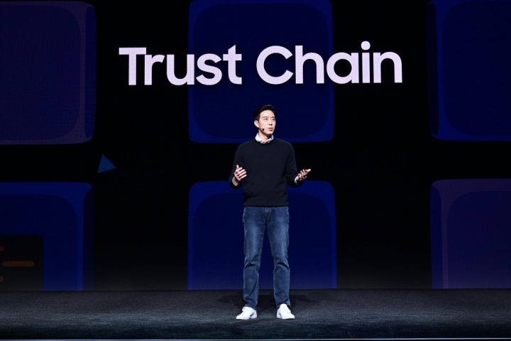 ▲ 삼성전자 MX 사업부 시큐리티팀 백신철 수석이 삼성 프레스 컨퍼런스에서 블록체인 기반의 개인정보보호 플랫폼인 ‘녹스 매트릭스(KNOX Matrix)’를 소개하고 있다.