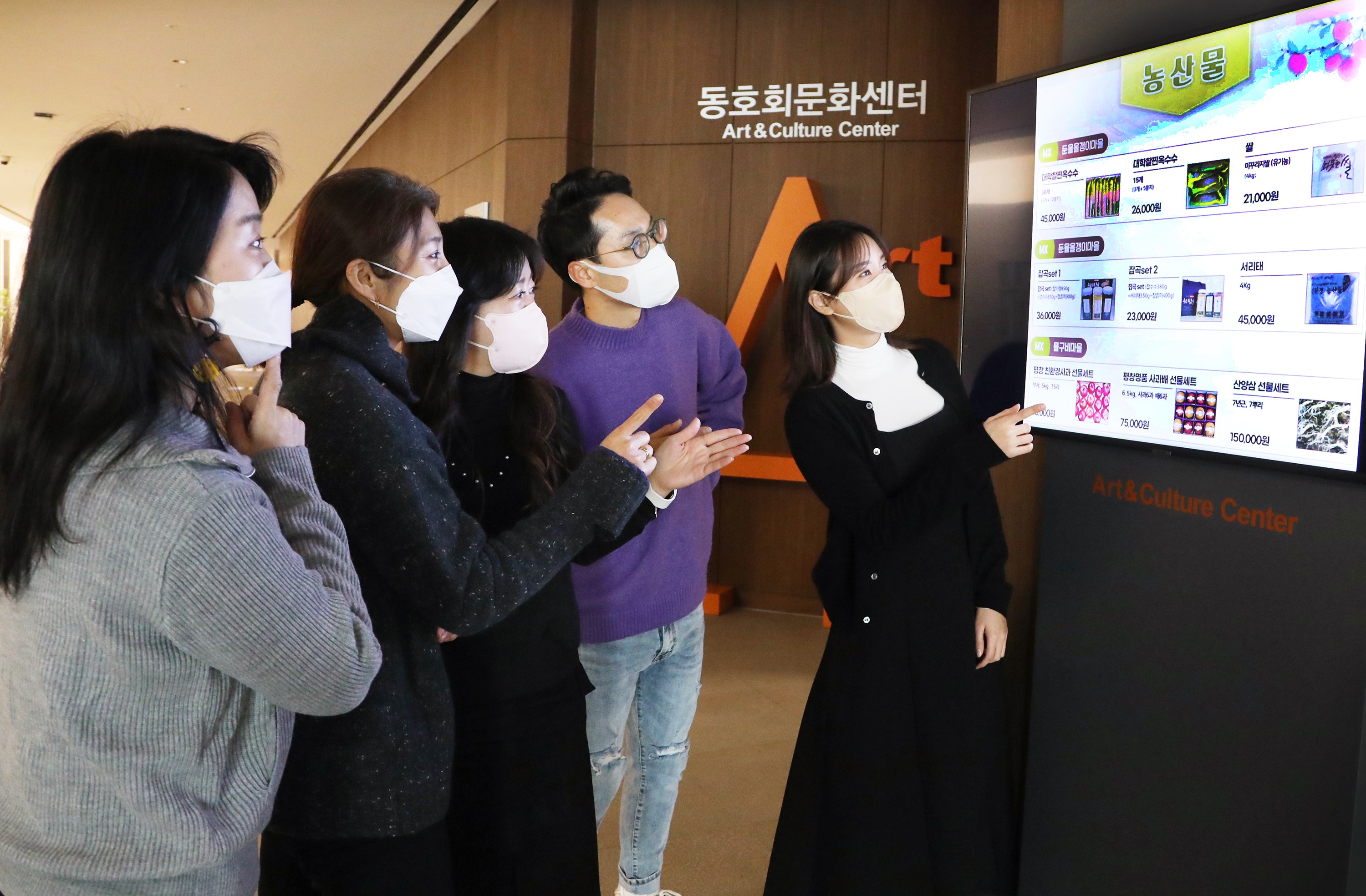 ▲ 삼성전자 직원들이 ‘2023 설 맞이 온라인 장터’ 판매 제품을 둘러보며 동료들과 이야기를 나누고 있는 모습