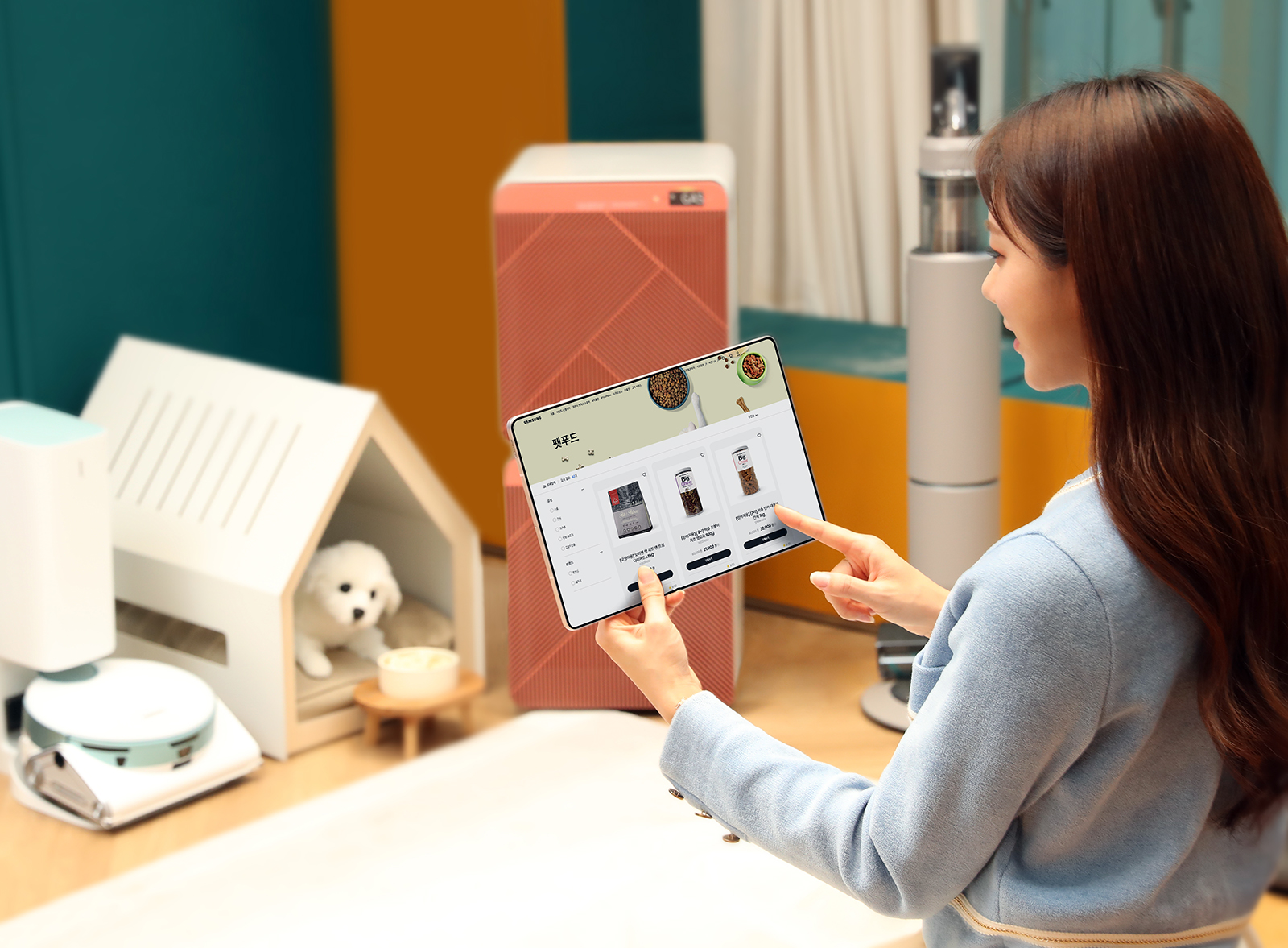 ▲삼성전자 모델이 삼성전자 ‘e식품관’에서 구입 가능한 펫푸드 제품을 확인하고 있는 모습. e식품관에서는 일반 식품 외에도 사료, 간식 등 다양한 펫푸드를 한 곳에서 간편하게 확인하고 구매할 수 있다.