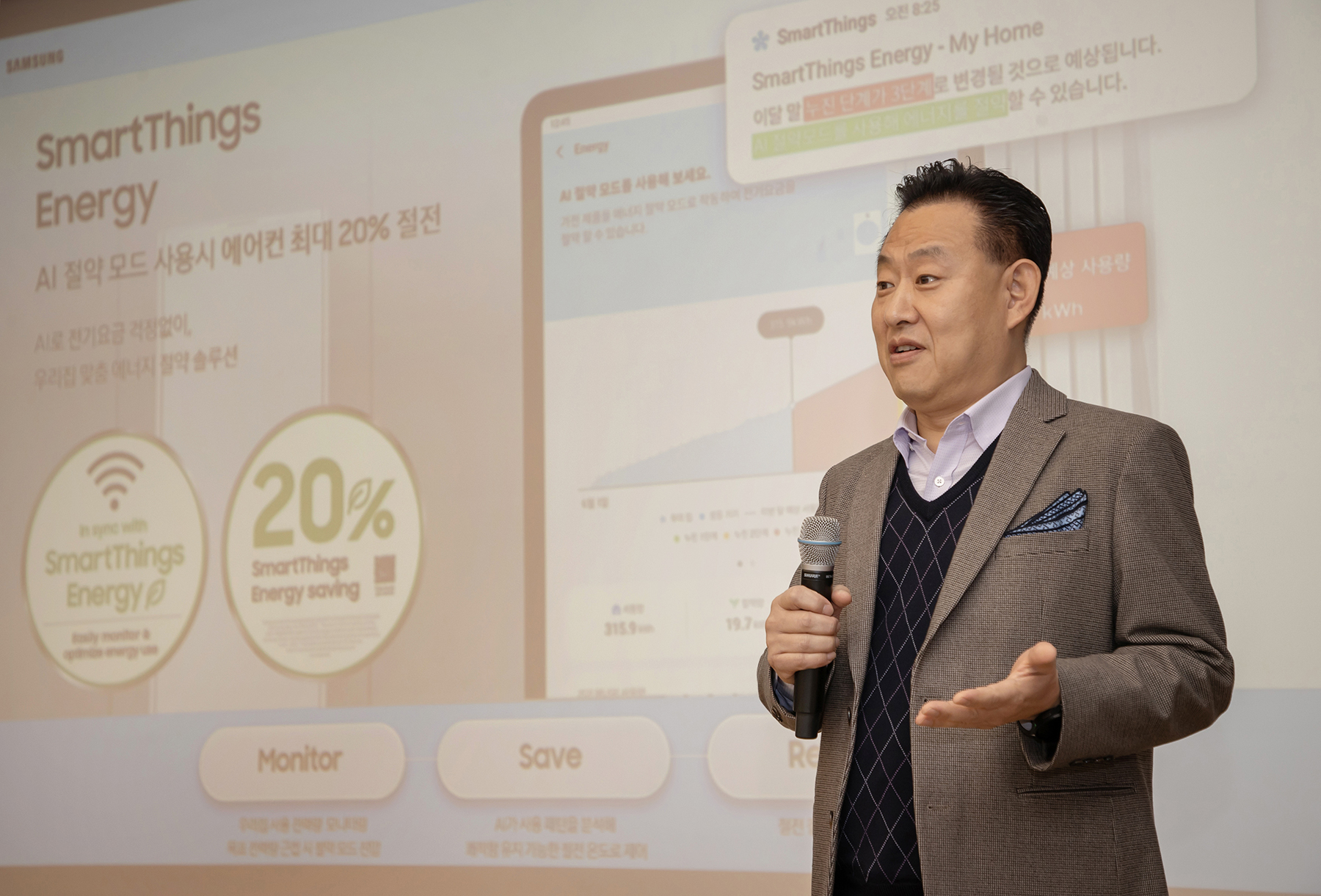 ▲삼성전자 생활가전사업부 최영준 상무가 삼성전자 서울 R&D 캠퍼스에서 진행된 미디어 브리핑에서 2023년형 에어솔루션 신제품을 소개하고 있는 모습