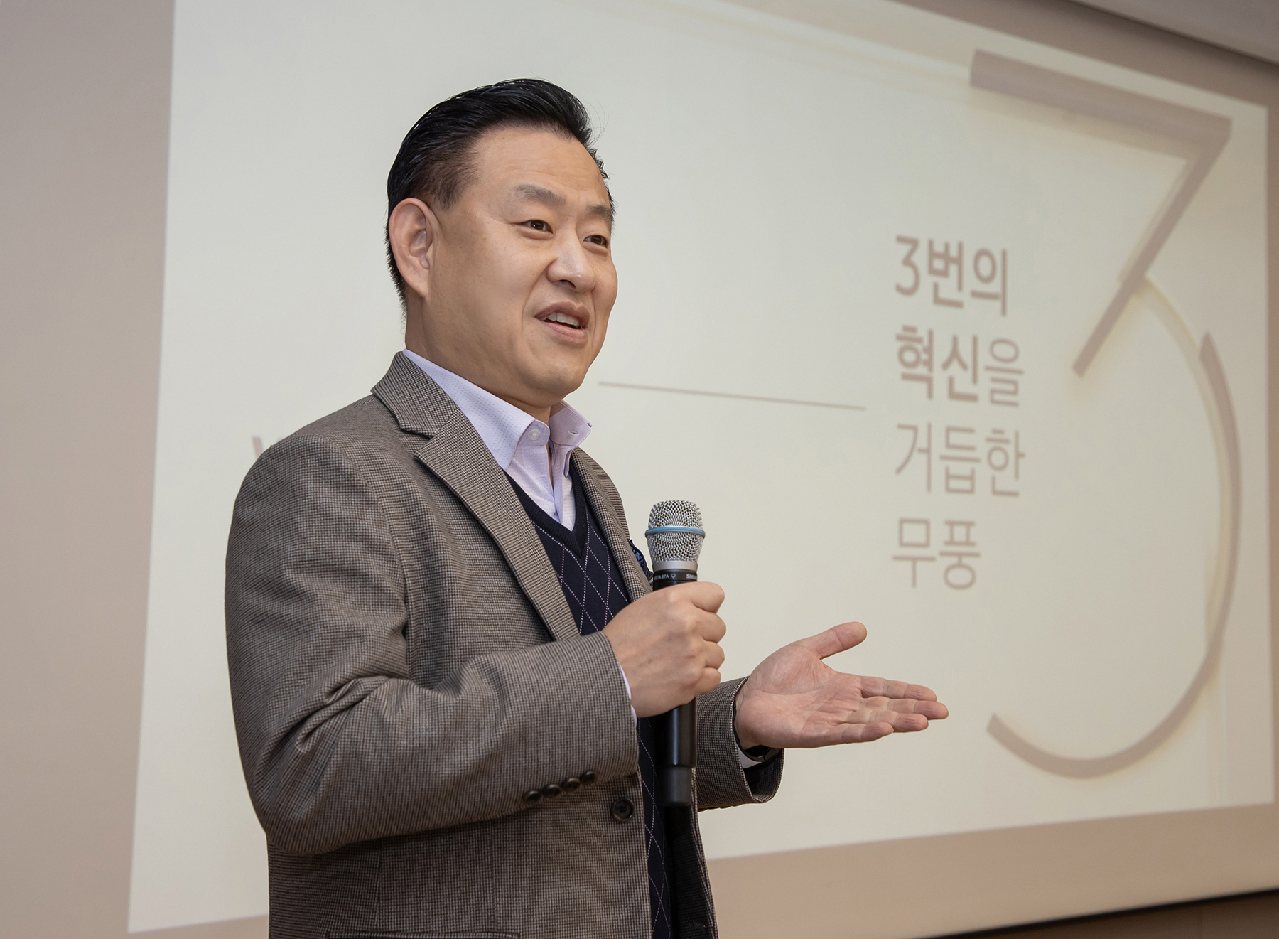 ▲삼성전자 생활가전사업부 최영준 상무가 삼성전자 서울 R&D 캠퍼스에서 진행된 미디어 브리핑에서 2023년형 에어솔루션 신제품을 소개하고 있는 모습