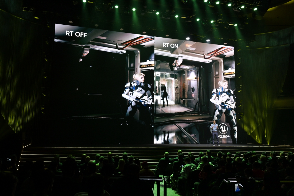 ▲ 다시 무대를 이어받은 드류 블랙커드는 레이 트레이싱(Ray Tracing) 적용 여부에 따른 게임 화면을 비교해 보여주며, 갤럭시 S23 울트라로 즐길 수 있는 몰입감 있는 게이밍 경험을 예고했다.