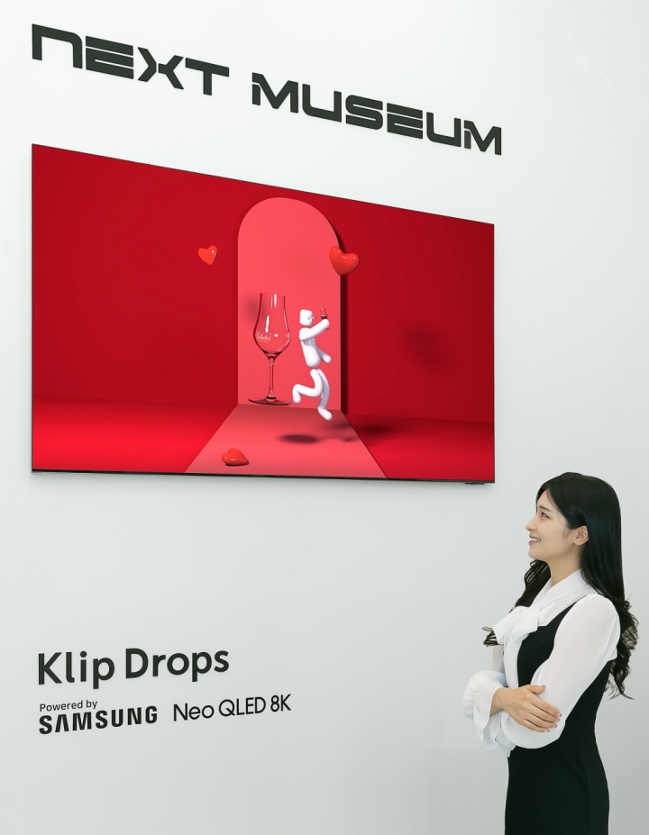 ▲삼성전자가 2월 9일부터 3월 19일까지 서울 잠실 롯데월드타워몰에 위치한 ‘넥스트 뮤지엄(Next Museum)’에서 Neo QLED 8K와 더 프레임을 통해 NFT 작품을 선보인다. 삼성전자 모델이 서울 잠실 롯데월드타워몰에 위치한 ‘넥스트 뮤지엄’에서 Neo QLED 8K와 더 프레임을 통해 전시되는 NFT 작품을 소개하고 있다.