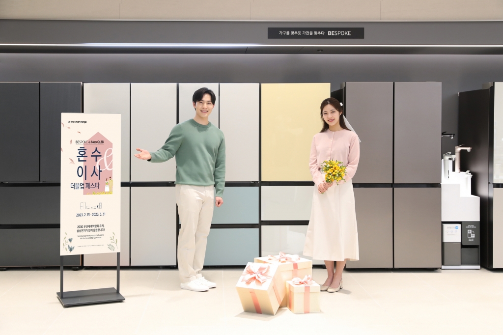 ▲ 삼성전자가 본격적인 결혼과 이사 시즌을 맞아 ‘혼수·이사 특별 기획전’을 실시한다. 삼성전자 모델이 삼성 프리미엄스토어 현대판교점에서 ‘혼수·이사 특별 기획전’을 소개하고 있는 모습