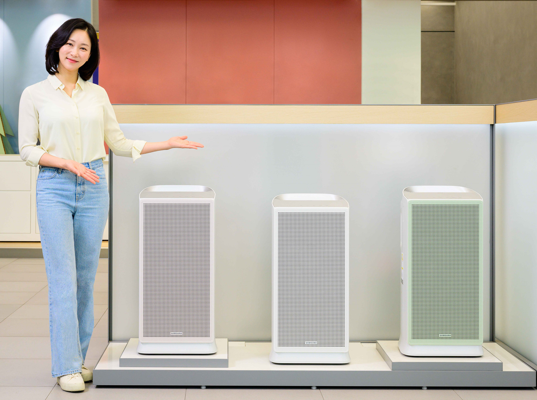 ▲ 삼성전자가 인공지능(AI) 기능이 강화된 2023년형 공기청정기 ‘블루스카이 5500’ 신제품을 20일 출시한다. 삼성전자 모델이 경기 용인시에 위치한 삼성 디지털프라자 용인구성본점에서 신제품 블루스카이 5500을 소개하고 있다.