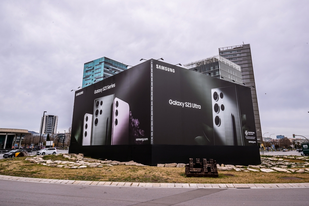 ▲삼성전자가 2월 27일부터 3월 2일까지 스페인 바르셀로나에서 열리는 ‘모바일 월드 콩그레스(MWC) 2023’에서 ‘2030 부산세계박람회(엑스포)’ 유치 활동을 알리고 있다. 삼성전자가 ‘MWC 2023’ 행사장 입구에 마련된 대형 갤럭시 옥외 광고에 ‘2030 부산엑스포’ 로고를 포함하고 박람회 유치 활동을 알리고 있다.