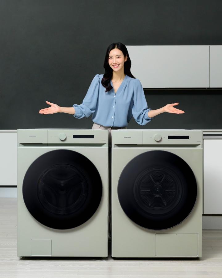 ▲삼성전자가 친환경·인공지능(AI) 기능이 대폭 강화된 ‘비스포크 그랑데 AI’ 세탁기와 건조기 신제품을 27일 출시한다. 삼성전자 모델이 친환경과 인공지능(AI) 기능이 대폭 강화된 ‘비스포크 그랑데 AI’ 세탁기와 건조기 신제품을 소개하고 있는 모습