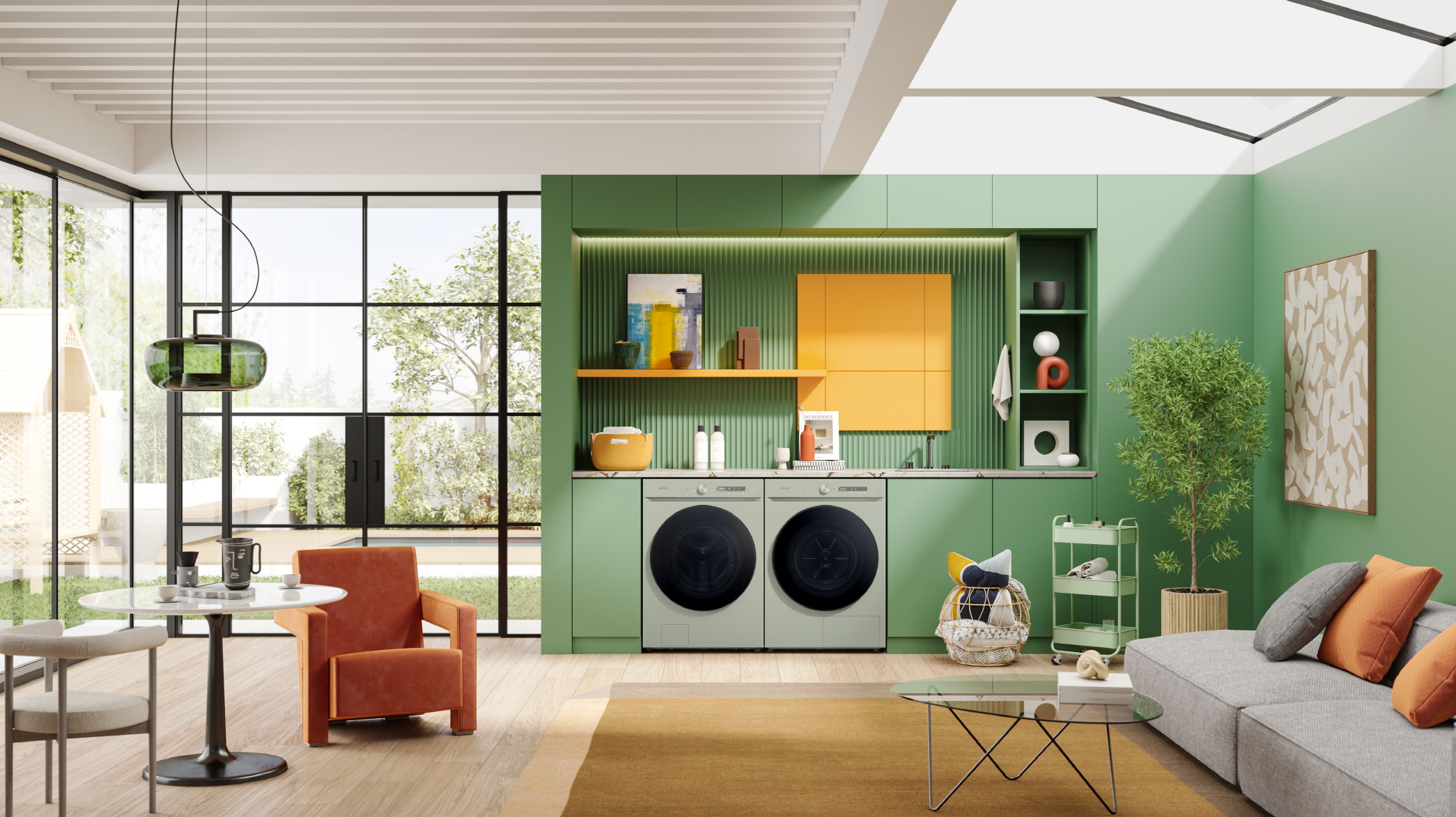 ▲삼성전자가 친환경·인공지능(AI) 기능이 대폭 강화된 ‘비스포크 그랑데 AI’ 세탁기와 건조기 신제품을 27일 출시한다. 새틴 세이지 그린 색상의 ‘비스포크 그랑데 AI’ 세탁기와 건조기 신제품 이미지