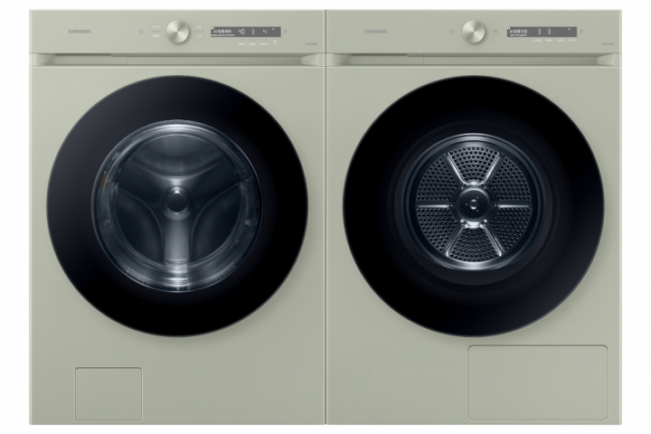 ▲삼성전자가 친환경·인공지능(AI) 기능이 대폭 강화된 ‘비스포크 그랑데 AI’ 세탁기와 건조기 신제품을 27일 출시한다. 새틴 세이지 그린 색상의 ‘비스포크 그랑데 AI’ 세탁기와 건조기 신제품 이미지