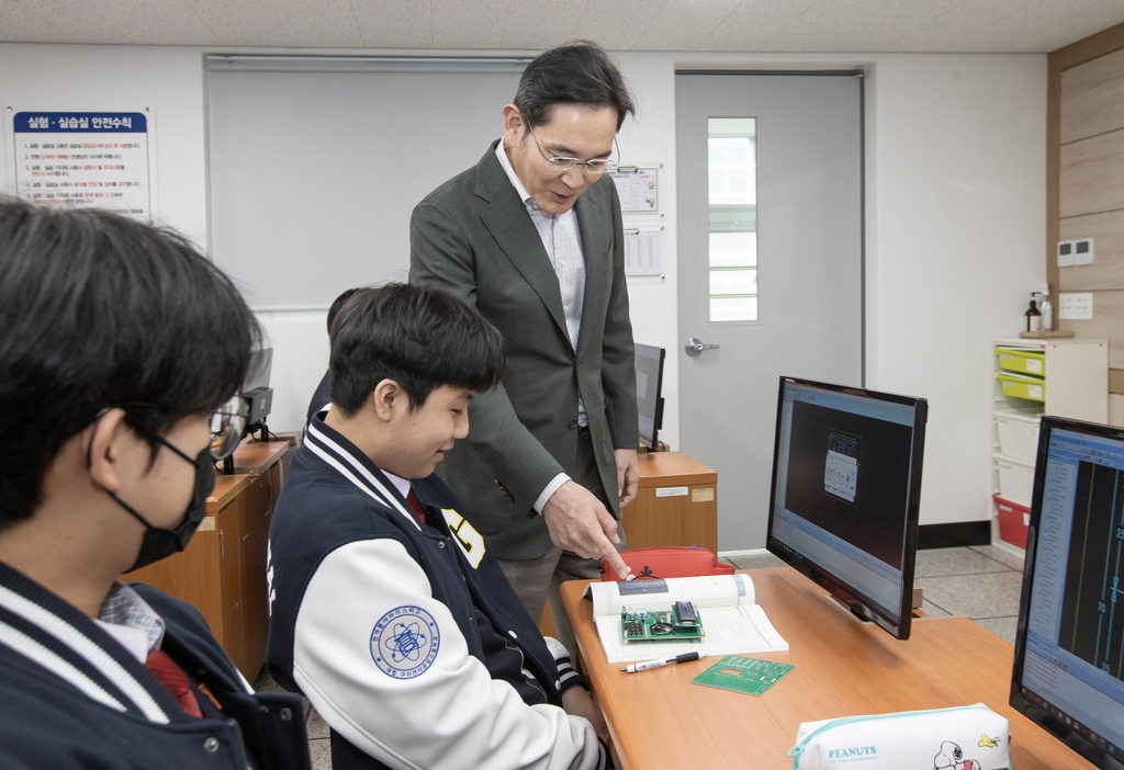 ▲ 이재용 삼성전자 회장이 7(화)일 경북 구미시에 위치한 ‘구미전자공업고등학교’를 방문했다. 이재용 삼성전자 회장이 7(화)일 경북 구미시에 위치한 ‘구미전자공업고등학교’를 방문해 수업을 참관하고 학생들과 기념사진을 촬영하는 모습