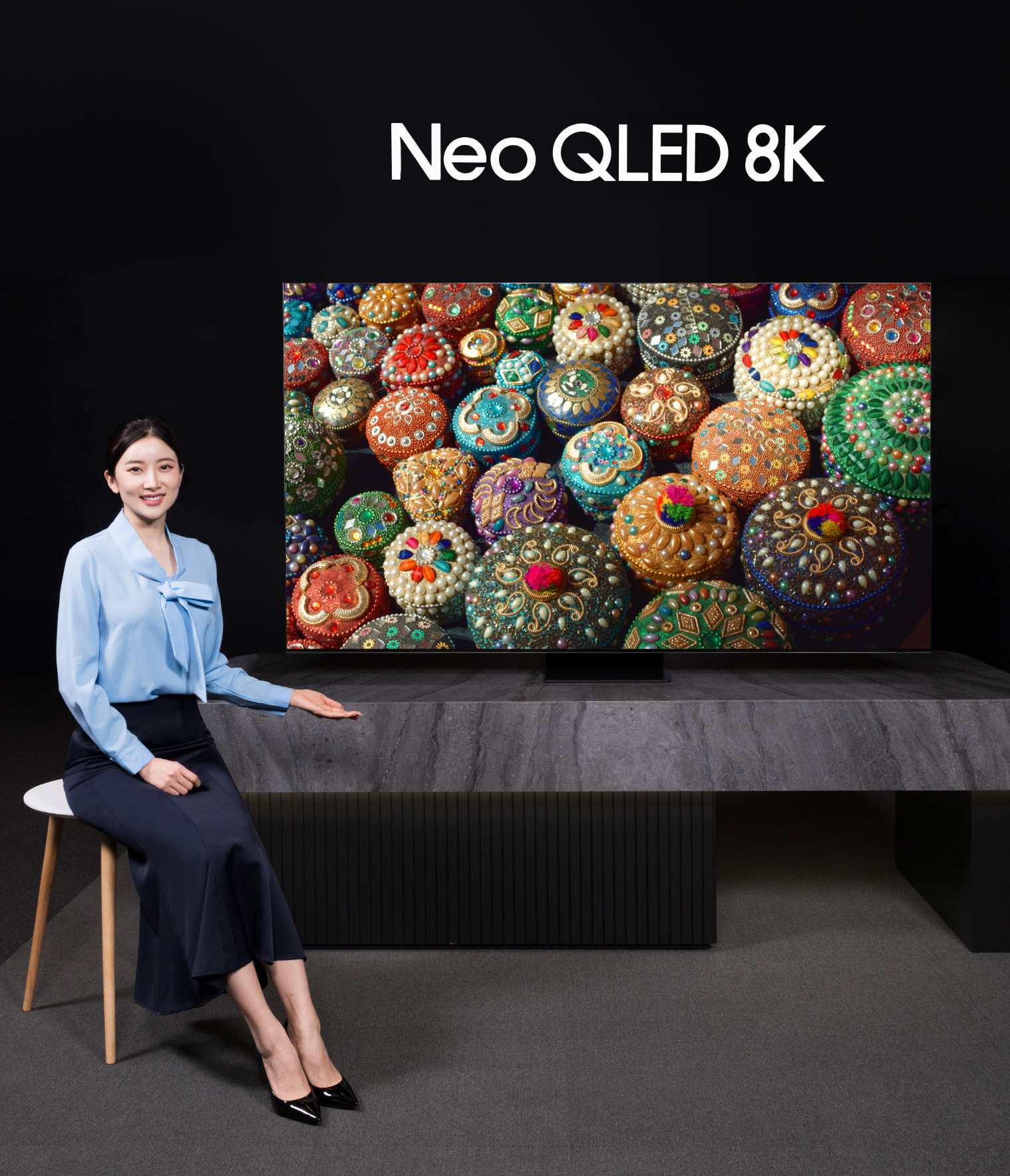 ▲삼성전자가 Neo QLEDㆍOLED 등 2023년형 TV 신제품을 9일 국내 시장에 공식 출시한다. 삼성전자 모델이 프리미엄 TV 시장을 주도하고 있는 Neo QLED 8K 2023년형 신제품을 소개하고 있는 모습.