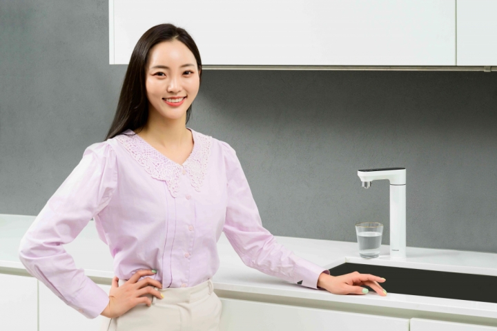 ▲삼성전자가 1인 가구나 소형 가구에 적합한 비스포크 정수기 신제품을 13일 출시한다. 삼성전자 모델이 경기도 수원시에 위치한 삼성전자 수원 디지털시티에서 비스포크 정수기 신제품을 소개하고 있다.