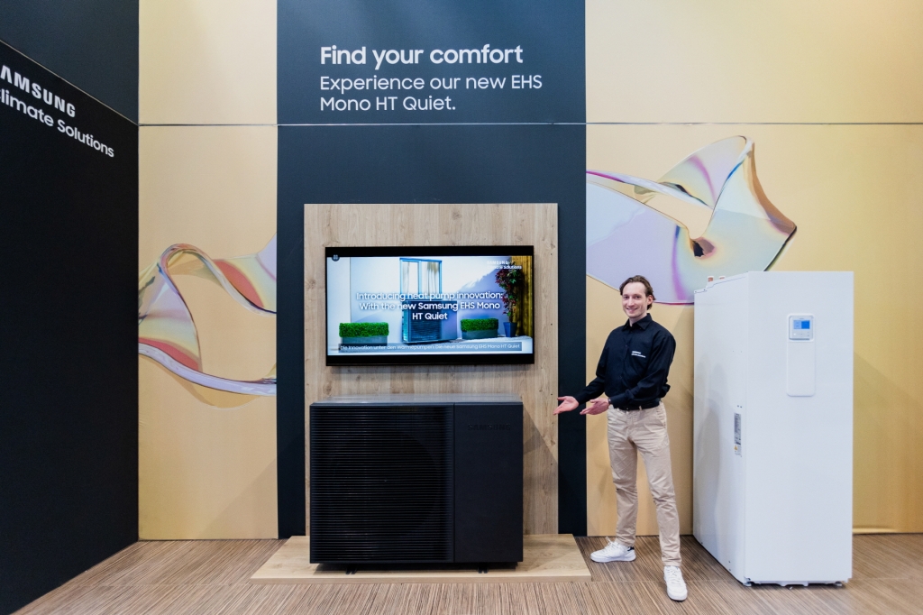 ▲삼성전자가 13일부터 17일(현지시간)까지 독일 프랑크푸르트에서 개최되는 냉·난방공조전시회 ‘ISH 2023(International trade fair for Sanitation, Heating and air)’에 처음으로 참가해 지속가능한 미래를 위한 공조 솔루션으로 유럽 공조시장을 적극 공략한다. 삼성전자 모델이 13일부터 17일(현지시간)까지 독일 프랑크푸르트에서 개최되는 냉·난방공조전시회 ‘ISH 2023’에서 고효율 냉난방 시스템인 히트펌프 EHS 신제품을 소개하고 있는 모습