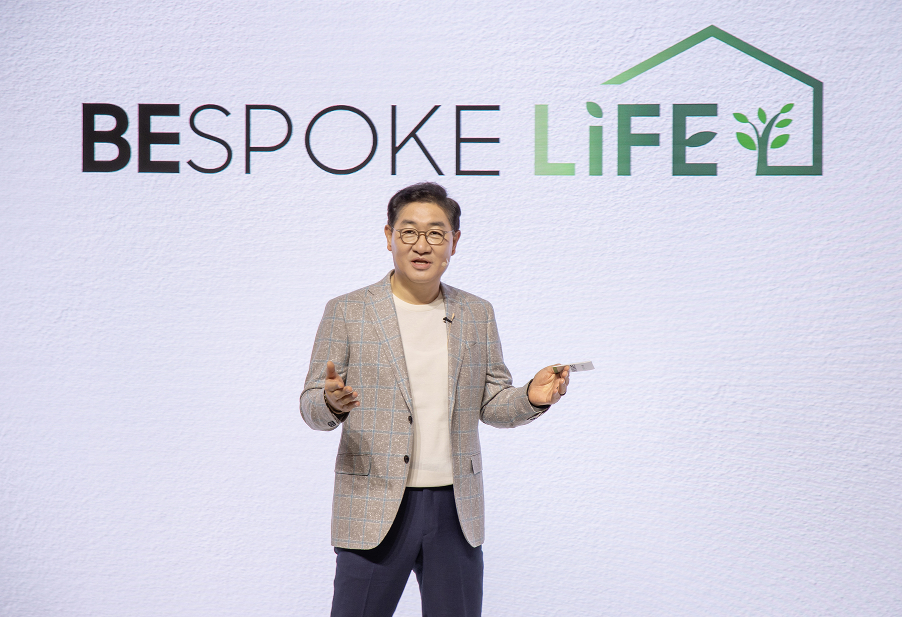 ▲삼성전자가 독보적인 에너지 절감 기술과 스마트한 인공지능(AI)으로 친환경 라이프스타일을 제안하는 2023년형 비스포크(BESPOKE) 가전 신제품 라인업을 21일 공개했다. 삼성전자 DX부문장 한종희 부회장이 21일 서울시 중구에 위치한 커뮤니티 하우스 ‘마실’에서 열린 ‘비스포크 라이프(BESPOKE Life)’ 미디어데이에서 기조연설을 하고 있는 모습.