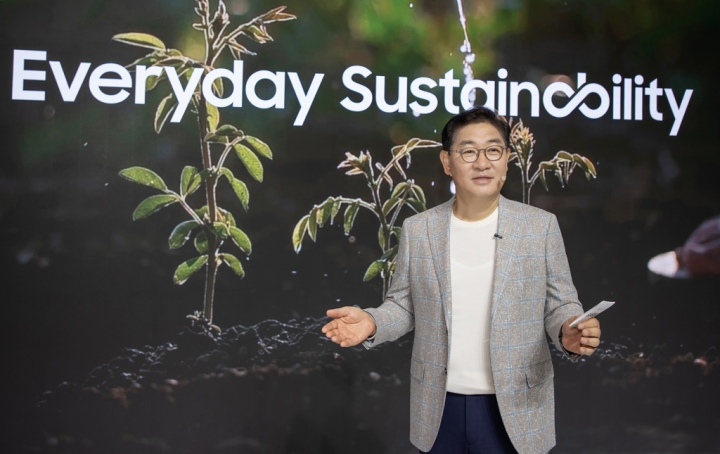 ▲삼성전자가 독보적인 에너지 절감 기술과 스마트한 인공지능(AI)으로 친환경 라이프스타일을 제안하는 2023년형 비스포크(BESPOKE) 가전 신제품 라인업을 21일 공개했다. 삼성전자 DX부문장 한종희 부회장이 21일 서울시 중구에 위치한 커뮤니티 하우스 ‘마실’에서 열린 ‘비스포크 라이프(BESPOKE Life)’ 미디어데이에서 기조연설을 하고 있는 모습.