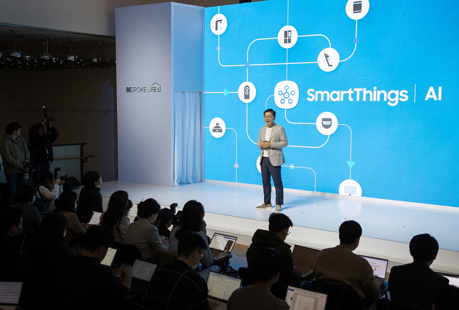 ▲삼성전자가 독보적인 에너지 절감 기술과 스마트한 인공지능(AI)으로 친환경 라이프스타일을 제안하는 2023년형 비스포크(BESPOKE) 가전 신제품 라인업을 21일 공개했다. 삼성전자 DX부문장 한종희 부회장이 21일 서울시 중구에 위치한 커뮤니티 하우스 ‘마실’에서 열린 ‘비스포크 라이프(BESPOKE Life)’ 미디어데이에서 기조연설을 하고 있는 모습.