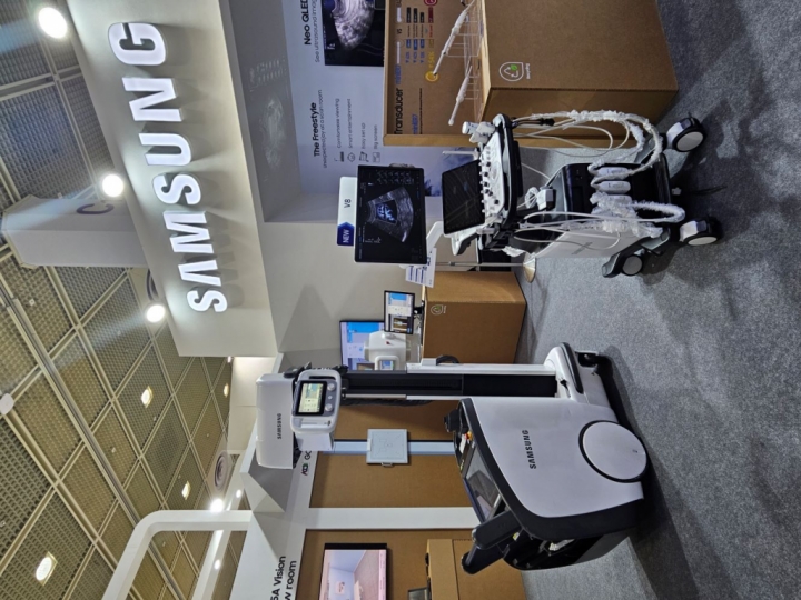 ▲삼성전자와 삼성메디슨은 23일부터 26일까지 서울 삼성동 코엑스에서 열리는 ‘제38회 국제의료기기·병원설비전시회(이하 KIMES, Korea International Medical & Hospital Equipment Show)’에 참가해 삼성의 최신 의료기기와 AI(인공지능) 진단 보조 기능들을 대거 선보인다. 삼성전자 부스에 전시된 프리미엄 초음파 진단기기 ‘V8′(오른쪽)과 이동형 엑스레이 ‘AccE GM85’