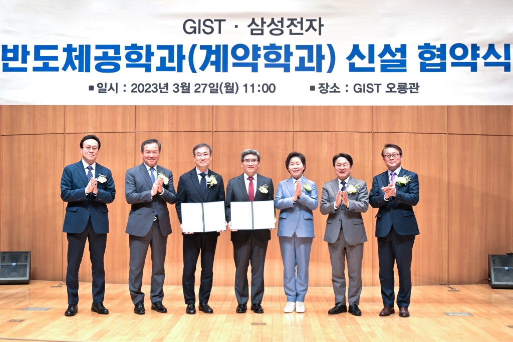 ▲삼성전자는 27일 반도체 전문 인재를 체계적으로 양성해 국가 반도체 생태계를 강화하고 지역 균형 발전에 기여하기 위해 울산/대구/광주 등 3개 과학기술원과 반도체 계약학과를 신설하기로 협약했다. 삼성전자와 광주과학기술원(GIST)은 27일 광주과학기술원 오룡관에서 회사와 학교 관계자 및 광주광역시 관계자, 국회의원 등 내외빈이 참석한 가운데 반도체 계약학과 신설 협약식을 가졌다. 사진 왼쪽부터 조정희 GIST 대학장, 이형석 국회의원, 박래길 GIST 총장직무대행, 송재혁 삼성전자 DS부문 CTO 사장, 양향자 국회의원, 강기정 광주광역시장, 박승희 삼성전자 CR담당 사장