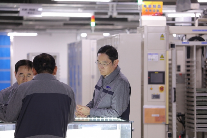 ▲ 이재용 삼성전자 회장은 24일 중국 텐진에 위치한 삼성전기 사업장을 방문해 전자부품 생산 공장을 점검하고 텐진 지역에서 근무하는 삼성 계열사 임직원들과 간담회를 가졌다. 이재용 삼성전자 회장이 24일 중국 텐진에 위치한 삼성전기 사업장을 방문해 MLCC 생산 공장을 점검하는 모습
