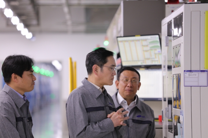 ▲ 이재용 삼성전자 회장은 24일 중국 텐진에 위치한 삼성전기 사업장을 방문해 전자부품 생산 공장을 점검하고 텐진 지역에서 근무하는 삼성 계열사 임직원들과 간담회를 가졌다. 이재용 삼성전자 회장이 24일 중국 텐진에 위치한 삼성전기 사업장을 방문해 MLCC 생산 공장을 점검하는 모습