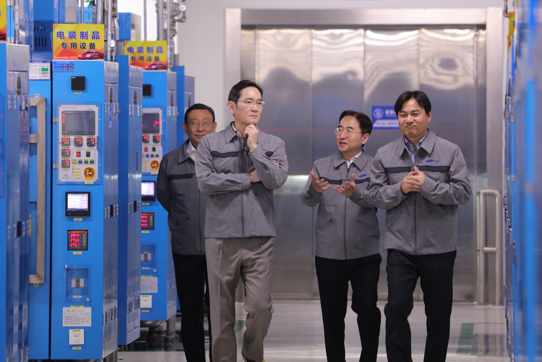 ▲ 이재용 삼성전자 회장은 24일 중국 텐진에 위치한 삼성전기 사업장을 방문해 전자부품 생산 공장을 점검하고 텐진 지역에서 근무하는 삼성 계열사 임직원들과 간담회를 가졌다. 이재용 삼성전자 회장이 24일 중국 텐진에 위치한 삼성전기 사업장을 방문해 MLCC 생산 공장을 점검하는 모습