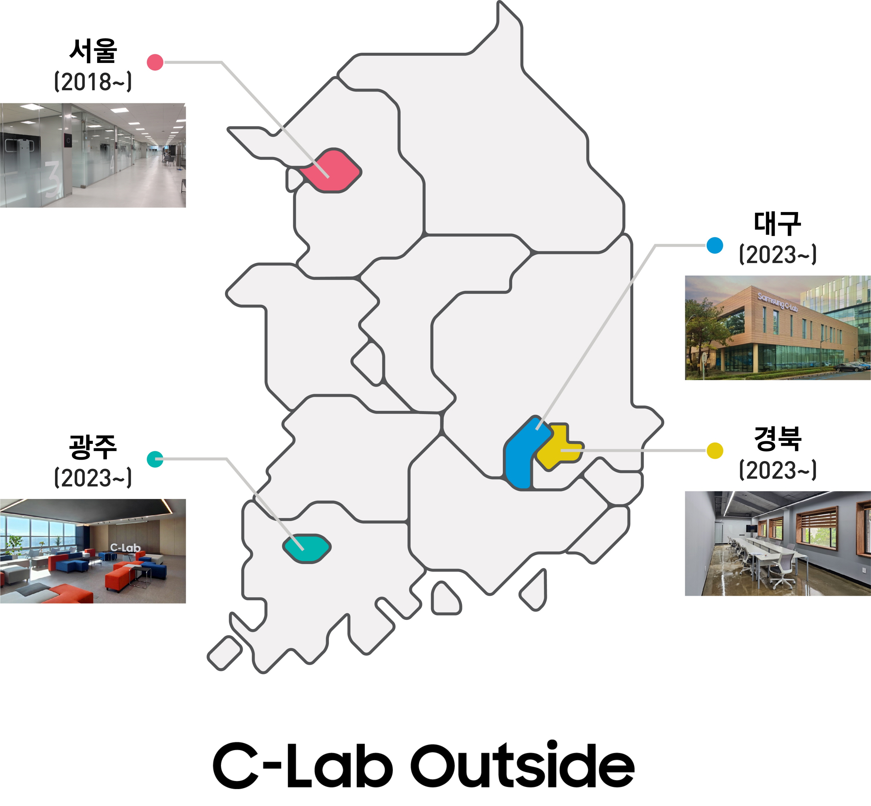▲삼성전자는 13일 경북 경산시 영남대에서 ‘C랩 아웃사이드 경북’ 개소식을 개최했다. C랩 아웃사이드 경북, 광주, 대구, 서울 거점을 나타낸 그래픽