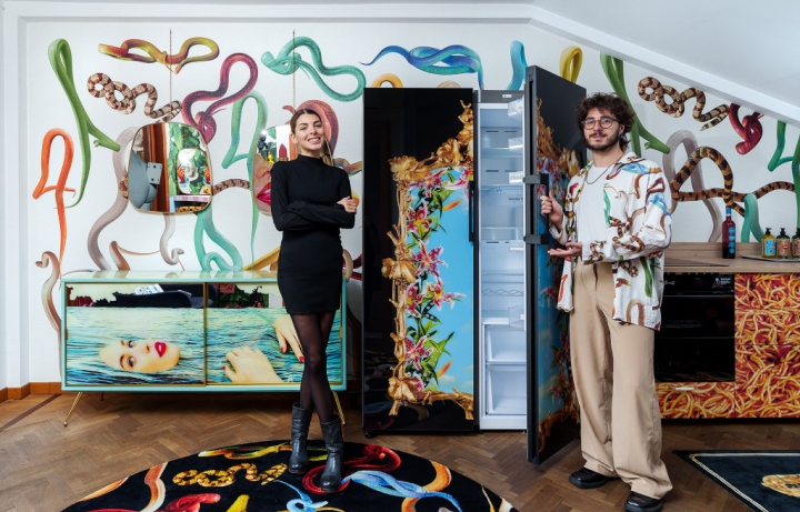▲ 삼성전자는 17일(현지시간) ‘푸오리살로네(Fuorisalone)’에서 이탈리아 크리에이티브 스튜디오인 ‘토일렛페이퍼(TOILETPAPER)’와 협업한 한정판 디자인 ‘비스포크 냉장고’를 소개했다. 삼성전자 모델이 이탈리아 밀라노에 위치한 ‘토일렛페이퍼 홈’에서 토일렛페이퍼의 가구ㆍ소품들과 함께 한정판 디자인 ‘비스포크 냉장고’를 선보이고 있다.