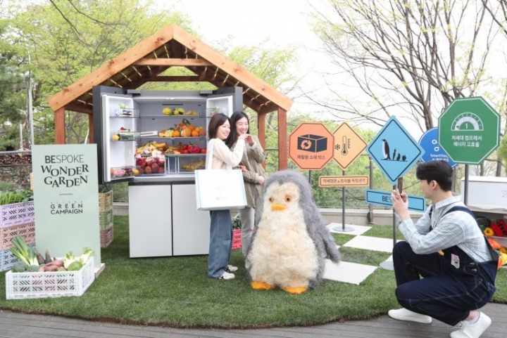 ▲삼성전자가 24일 남산서울타워에서 진행되는 ‘2023 얼루어 그린 캠페인’에 참가해 비스포크 냉장고의 지속 가능한 푸드 라이프를 소개했다.24일 남산서울타워에서 진행되는 ‘2023 얼루어 그린 캠페인’에 마련된 삼성전자 전시관 ‘이상한 포토존’에서 방문객들이 비스포크 냉장고와 펭귄 그로브몬스터, 김은하 작가의 업사이클링 작품과 함께 인증샷을 남기는 모습. 이번 전시관은 ‘비스포크 원더가든’ 콘셉트로 꾸며졌다.