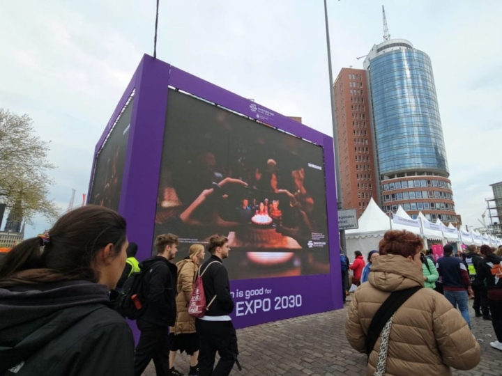▲삼성전자가 5일부터 7일까지 독일 함부르크에서 열리는 유럽 최대 항구축제인 ‘제834회 함부르크 개항축제’에서 ‘2030 부산세계박람회(엑스포)’ 유치 활동을 홍보했다. 삼성전자가 5일부터 7일까지 독일 함부르크에서 열린 유럽 최대 항구축제인 제834회 함부르크 개항축제에서 행사장 내 주요 거리와 공식 무대의 대형 스크린을 통해 2030 부산세계박람회 유치 활동을 홍보했다. 사진은 행사장의 대형 큐브 스크린에 부산엑스포 광고를 선보인 모습.