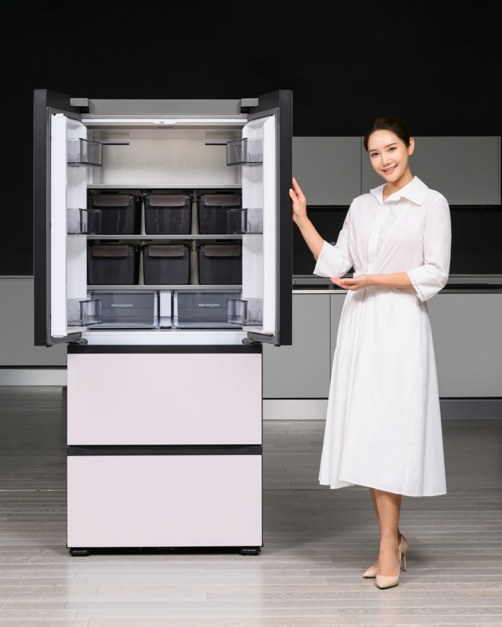 ▲삼성전자가 에너지 효율성을 강화한 프리미엄 김치냉장고 ‘비스포크 김치플러스’ 신제품을 16일부터 순차적으로 출시한다. 삼성전자 모델이 에너지 효율성을 강화한 프리미엄 김치냉장고 ‘비스포크 김치플러스’를 소개하고 있는 모습