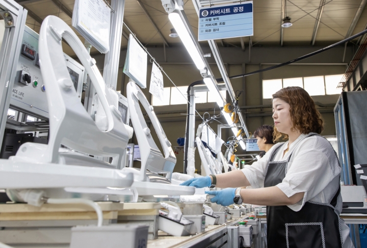 ▲삼성전자는 인공지능(AI)과 데이터 기술을 활용해 중소기업 제조 현장을 지능형 공장으로 고도화하는 ‘스마트공장 3.0’ 사업을 시작한다.충청남도 아산에 위치한 비데 전문기업 ‘에이스라이프’에서 직원이 비데 제품의 품질 상태를 점검하고 있다.