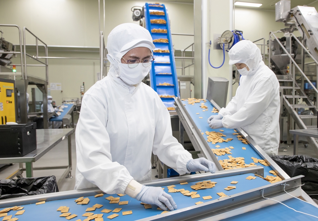 ▲삼성전자는 인공지능(AI)과 데이터 기술을 활용해 중소기업 제조 현장을 지능형 공장으로 고도화하는 ‘스마트공장 3.0’ 사업을 시작한다.전라남도 여수에 위치한 식품기업 ‘쿠키아’에서 삼성전자 스마트공장 담당자(오른쪽)과 쿠키아 직원이 두부과자 품질 상태를 점검하고 있다.