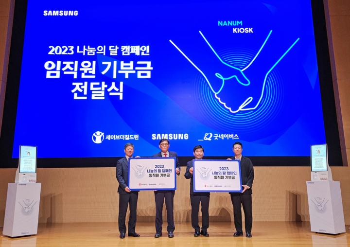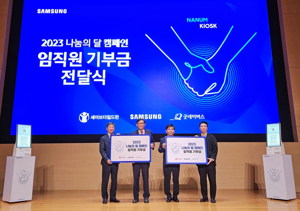 ▲삼성전자는 31일 오전 10시 삼성전자 수원사업장에서 가정의 달을 맞아 5월 한달 간 진행된 ‘나눔의 달’ 캠페인을 결산하는 ‘2023 나눔의 날’ 행사를 가졌다. 31일 삼성전자 수원사업장에서 열린 ‘2023 나눔의 날’ 행사에서 (왼쪽부터) 삼성전자 법무실장 김수목 사장, 삼성전자 최장원 사원대표가 세이브더칠드런 정태영 총장, 굿네이버스 김웅철 사무총장에게 기부금을 전달하고 있다.
