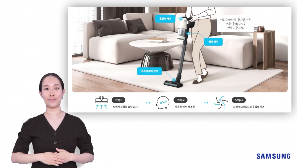 ▲삼성전자가 문화체육관광부와 협업해 청소기 사용법을 수어로 안내한다. 삼성전자가 문화체육관광부 ‘수어와 만나다’ 프로젝트에 참여해 비스포크 청소기 사용법을 수어로 안내한다. 삼성전자가 문화체육관광부 ‘수어와 만나다’ 프로젝트에 참여해 비스포크 청소기 사용법을 수어로 안내한다. ‘비스포크 제트 AI’와 ‘비스포크 제트 봇 AI’의 사용 관리법을 담은 수어 영상 중 김민재 수어통역사가 청소기 사용법을 소개하고 있는 모습