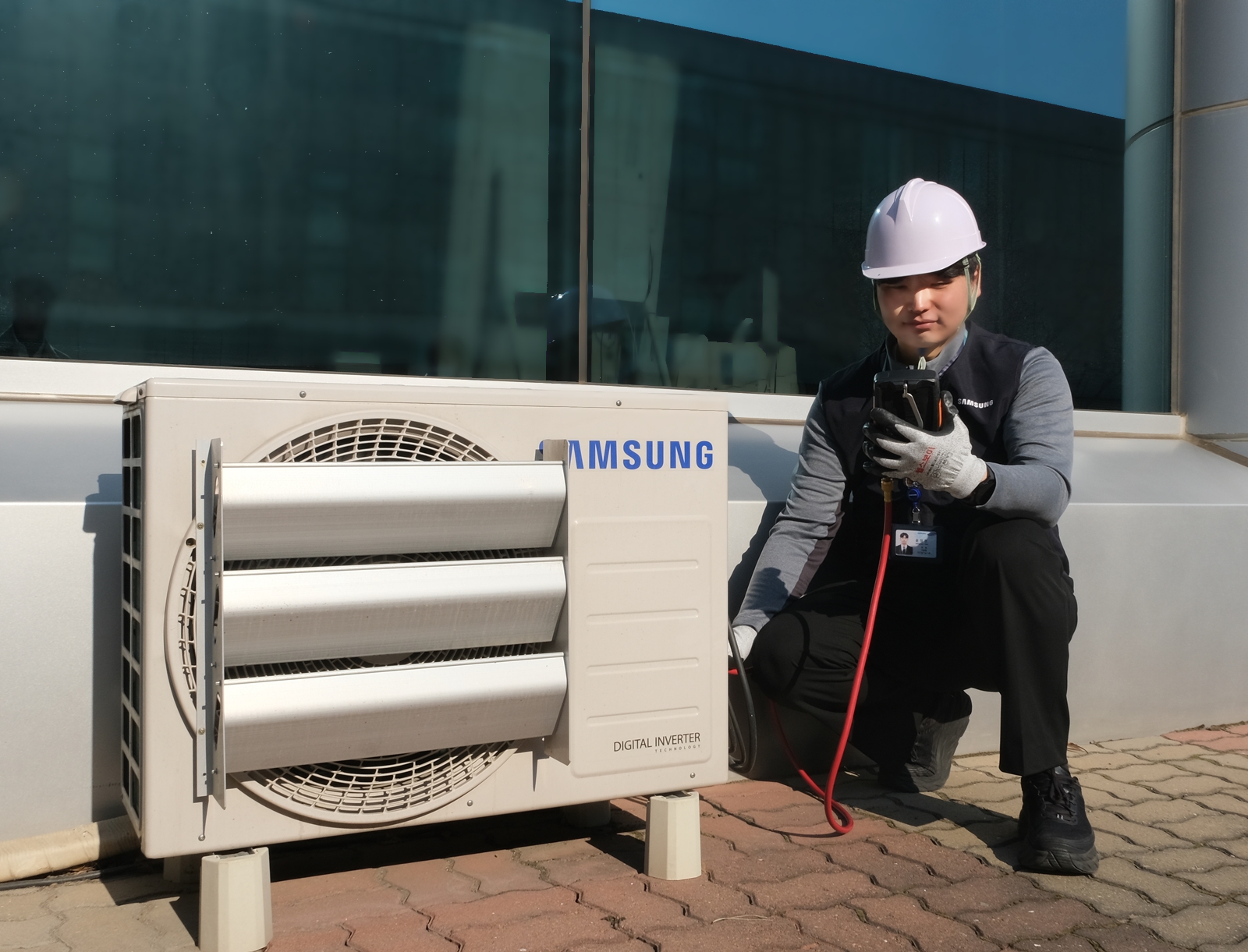 ▲기상청에서 발표한 2023년 3개월(5∼7월) 기후 전망에 따르면, 6~7월 기온이 평년과 비슷하거나 높아 6월부터 에어컨 사용이 급증할 걸로 예상된다. 삼성전자서비스 엔지니어가 ‘에어컨 사전점검’을 신청한 고객의 실외기를 점검하고 있다