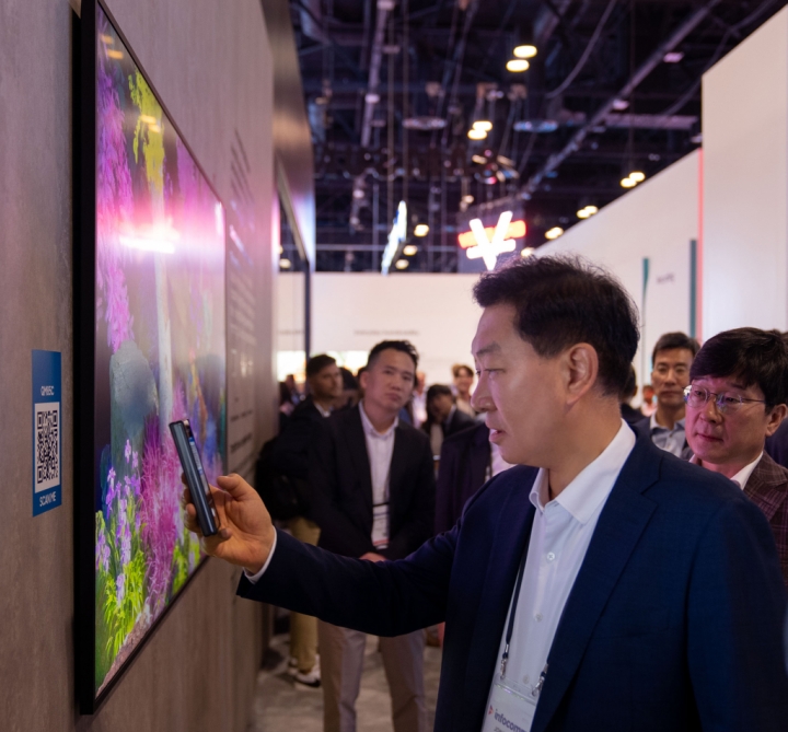 ▲미국 올랜도에서 16일까지 열리고 있는 북미 최대 디스플레이 전시회 ‘인포컴 2023’에서 삼성전자가 다양한 디스플레이 신제품을 대거 선보이며 관람객들의 시선을 끌고 있다. 삼성전자 DX부문장 한종희 부회장이 2023년형 스마트 사이니지 QMC 제품 앞에서 QR코드를 통해 제품의 생애주기 기반의 탄소배출량 저감활동 정보를 확인해보고 있다. 2023년형 스마트 사이니지 QMC 제품은 사이니지 업계 최초로 TUV 라인라인드가 수여하는 ‘탄소발자국 인증’을 취득했다.