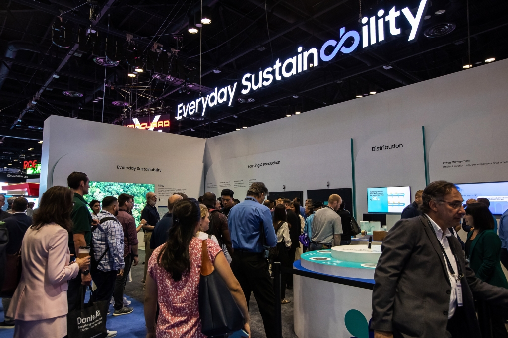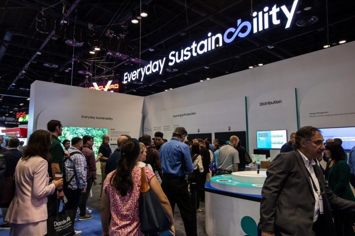 ▲미국 올랜도에서 16일까지 열리고 있는 북미 최대 디스플레이 전시회 ‘인포컴 2023’에서 삼성전자가 다양한 디스플레이 신제품을 대거 선보이며 관람객들의 시선을 끌고 있다.삼성전자 부스를 찾은 관람객들이 전시장 전면에 소개된 제품 생애주기별 친환경 노력에 대해 살펴보고 있다. 삼성의 환경 전략(Samsung Environmental Strategy)은 북미 AV 매체인 SCN(Systems Contractor News)로부터 ‘가장 혁신적인 지속가능 제품/전략(Most Innovative Sustainable Product Strategy)’ 부문으로 선정됐다.