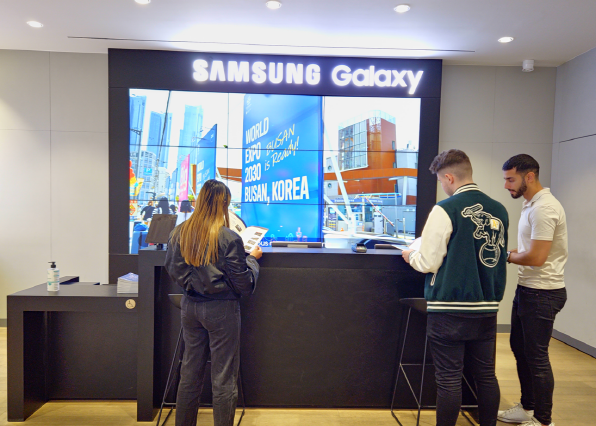 ▲삼성전자가 오는 20일부터 21일까지 국제박람회기구(BIE) 172차 총회가 열리는 프랑스 파리에서 ‘2030 부산세계박람회(엑스포)’ 유치 활동을 홍보한다. 삼성전자가 파리 근교 벨리지에 위치한 삼성 매장에서 ‘2030 부산 엑스포’ 유치 응원 홍보 영상을 상영하고 있다.