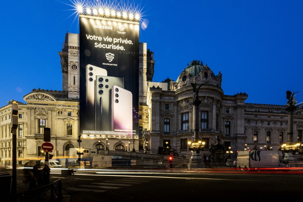 ▲삼성전자가 오는 20일부터 21일까지 국제박람회기구(BIE) 172차 총회가 열리는 프랑스 파리에서 ‘2030 부산세계박람회(엑스포)’ 유치 활동을 홍보한다. 삼성전자가 파리 오페라 가르니에 외벽에 마련된 갤럭시 옥외 광고에 ‘2030 부산 엑스포’ 로고를 포함하고 박람회 유치 활동을 알리고 있다.