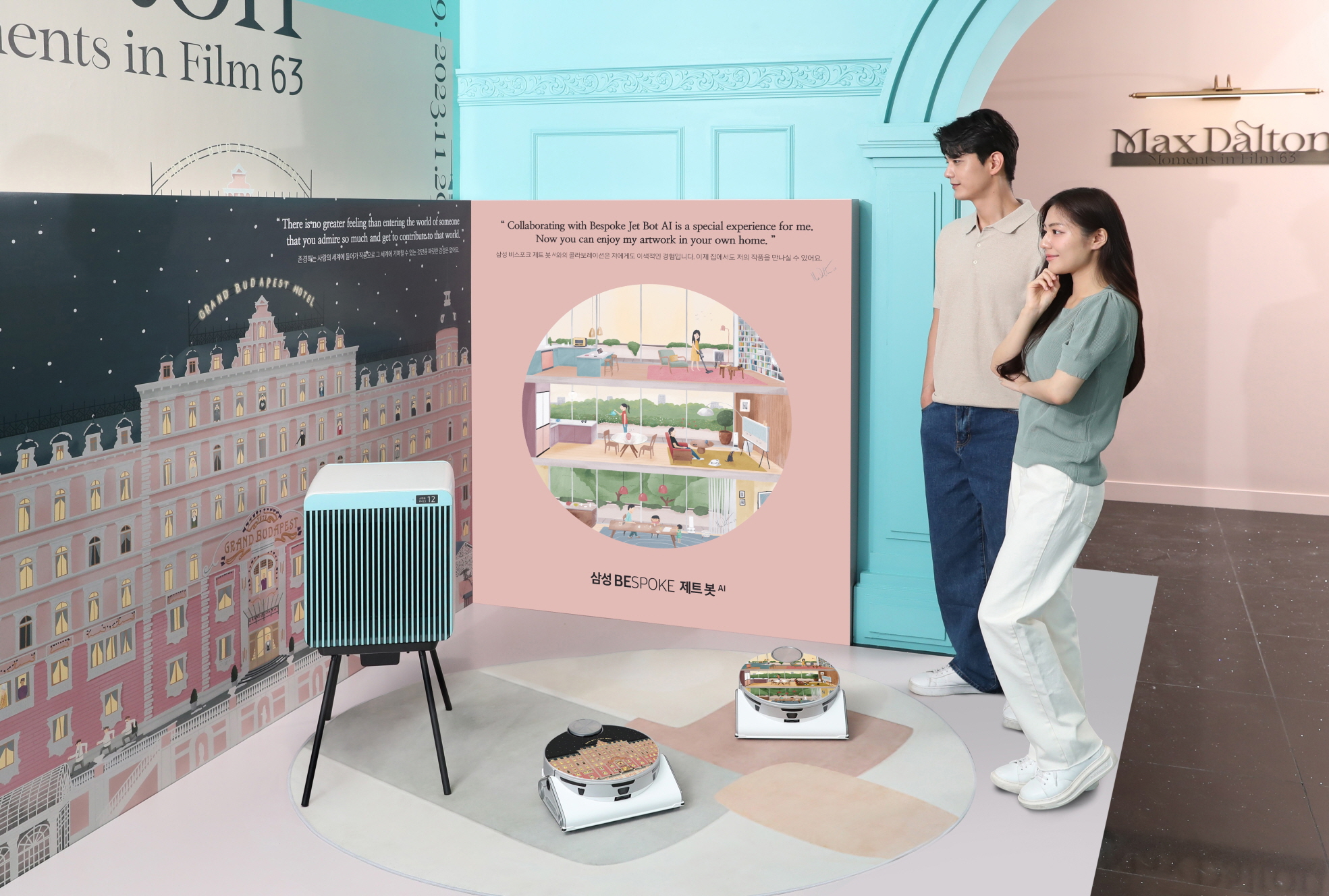 ▲삼성전자가 세계적인 일러스트레이터 ‘맥스 달튼(Max Dalton)’과 협업해 ‘비스포크 제트 봇 AI’ 스페셜 에디션 제품을 공개했다. 삼성전자 모델이 맥스 달튼 대표작 ‘그랜드 부다페스트 호텔’ 일러스트와 삼성 비스포크 라이프를 모티브로 제작한 ‘비스포크 제트 봇 AI’ 스페셜 에디션을 소개하고 있는 모습. 스페셜 에디션은 서울시 영등포구 ‘63 아트’에서 열리는 ‘맥스 달튼, 영화의 순간들 63 에피소드2’ 전시장에서 만나볼 수 있다.