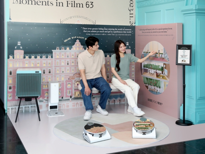 ▲삼성전자가 세계적인 일러스트레이터 ‘맥스 달튼(Max Dalton)’과 협업해 ‘비스포크 제트 봇 AI’ 스페셜 에디션 제품을 공개했다. 삼성전자 모델이 맥스 달튼 대표작 ‘그랜드 부다페스트 호텔’ 일러스트와 삼성 비스포크 라이프를 모티브로 제작한 ‘비스포크 제트 봇 AI’ 스페셜 에디션을 소개하고 있는 모습. 스페셜 에디션은 서울시 영등포구 ‘63 아트’에서 열리는 ‘맥스 달튼, 영화의 순간들 63 에피소드2’ 전시장에서 만나볼 수 있다.