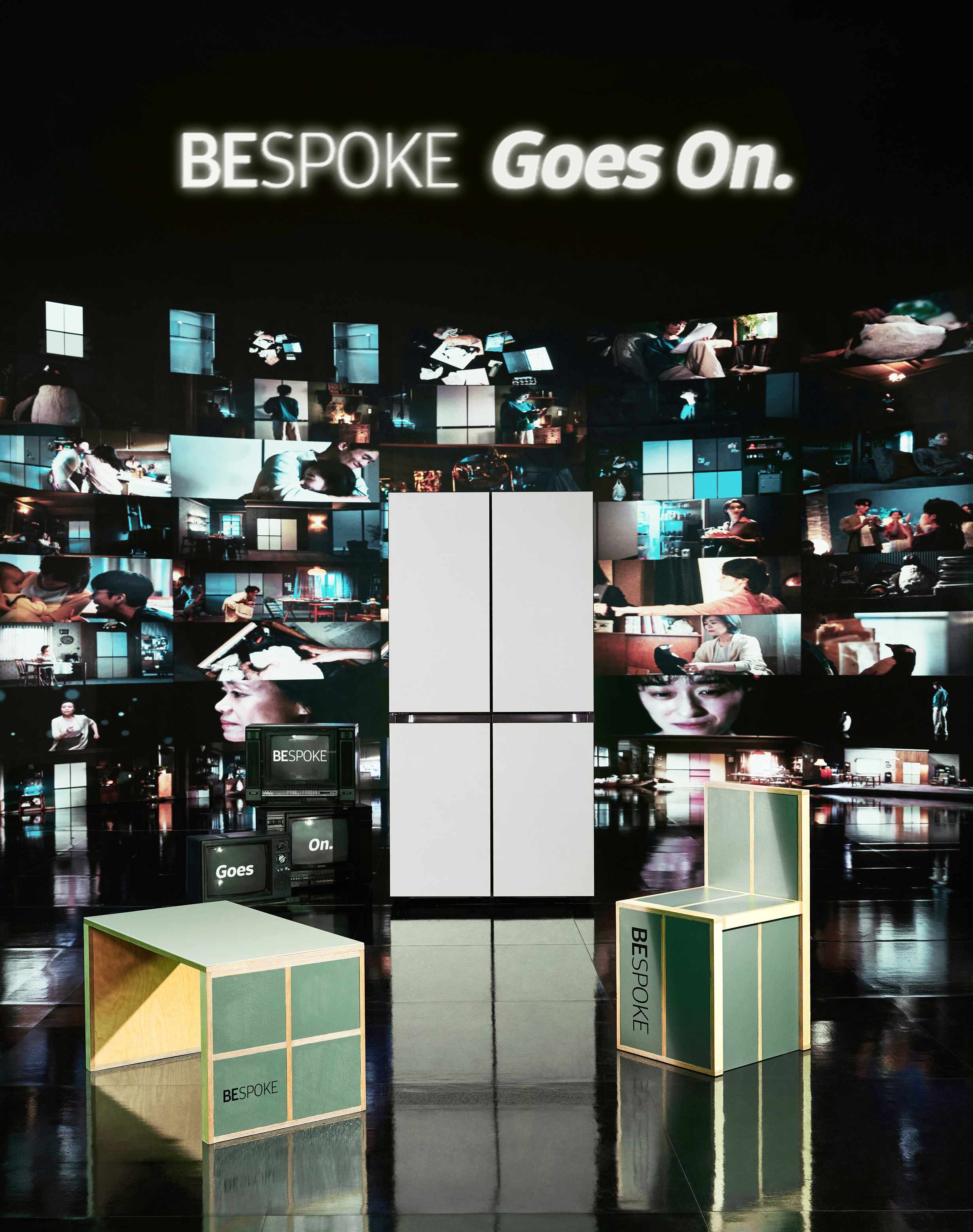 ▲ 삼성전자가 절전 가전 ‘비스포크 냉장고’의 광고 제작 소품을 업사이클링한 아트 작품을 공개했다. 삼성전자가 이규한·김은하 작가와 협업해 비스포크 냉장고 광고 세트장·의상을 업사이클링한 아트 작품을 선보였다. 이규한 작가가 비스포크 냉장고의 새틴 세이지그린 패널과 촬영 세트장 가벽을 활용해 만든 테이블과 의자 세트 작품 이미지