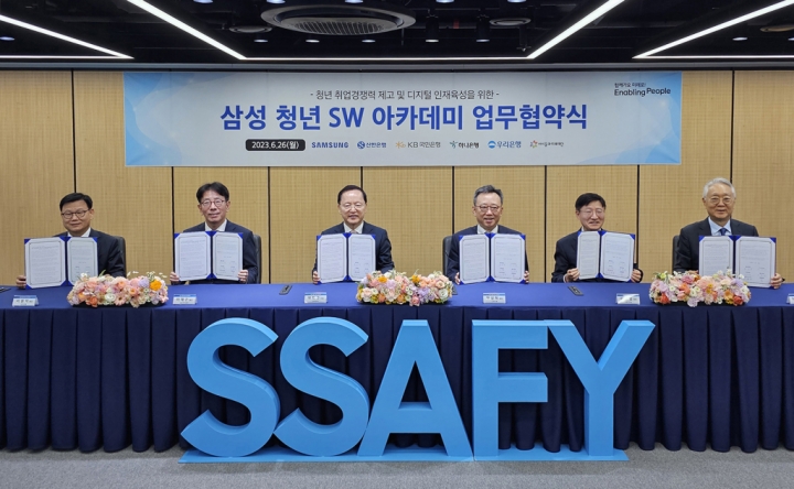 ▲삼성과 신한∙KB국민∙하나∙우리은행 등 4대 은행은 26일 서울 강남구 ‘삼성청년SW아카데미(Samsung Software Academy For Youth, 이하 SSAFY)’ 서울 캠퍼스에서 ‘청년 취업경쟁력 제고 및 디지털 인재육성을 위한 업무 협약’을 맺었다. (왼쪽부터) 우리은행 이원덕 행장, KB국민은행 이재근 행장, 삼성전자 박학규 사장, 신한은행 정상혁 행장, 하나은행 이승열 행장, 아이들과미래재단 이훈규 이사장