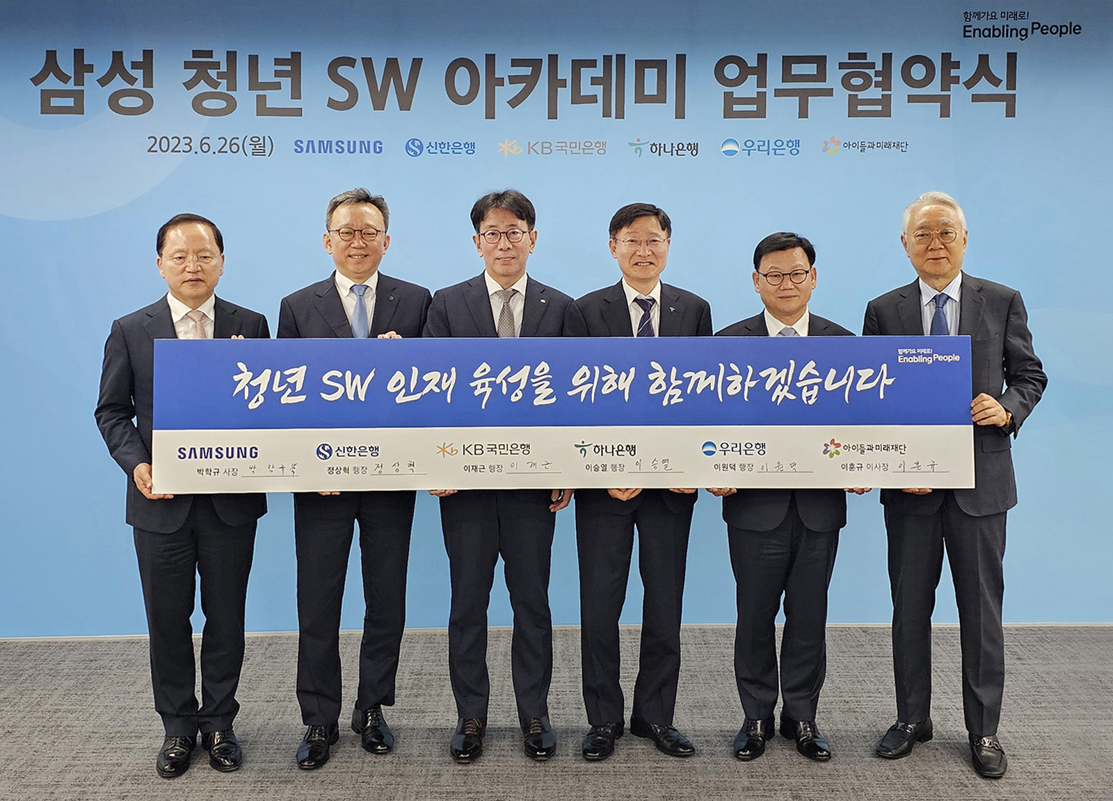 ▲삼성과 신한∙KB국민∙하나∙우리은행 등 4대 은행은 26일 서울 강남구 ‘삼성청년SW아카데미(Samsung Software Academy For Youth, 이하 SSAFY)’ 서울 캠퍼스에서 ‘청년 취업경쟁력 제고 및 디지털 인재육성을 위한 업무 협약’을 맺었다. (왼쪽부터) 삼성전자 박학규 사장, 신한은행 정상혁 행장, KB국민은행 이재근 행장, 하나은행 이승열 행장, 우리은행 이원덕 행장, 아이들과미래재단 이훈규 이사장