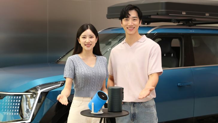 ▲ 삼성전자가 기아 플래그십 SUV ‘EV9’ 출시를 기념해 포터블 스크린 ‘더 프리스타일(The Freestyle) EV9 에디션’을 선보인다. 삼성전자 모델이 부천 기아플래그쉽 스토어에서 ‘더 프리스타일(The Freestyle) EV9 에디션’을 소개하고 있는 모습