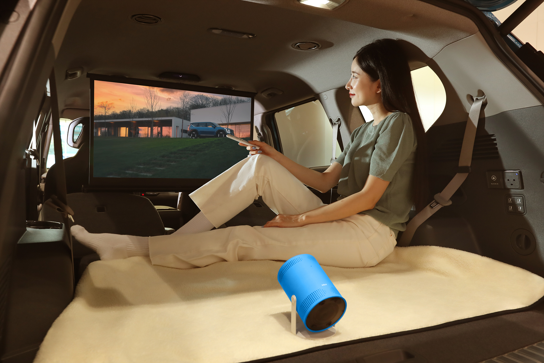▲ 삼성전자가 기아 플래그십 SUV ‘EV9’ 출시를 기념해 포터블 스크린 ‘더 프리스타일(The Freestyle) EV9 에디션’을 선보인다. 삼성전자 모델이 부천 기아플래그쉽 스토어에서 ‘더 프리스타일(The Freestyle) EV9 에디션’을 소개하고 있는 모습